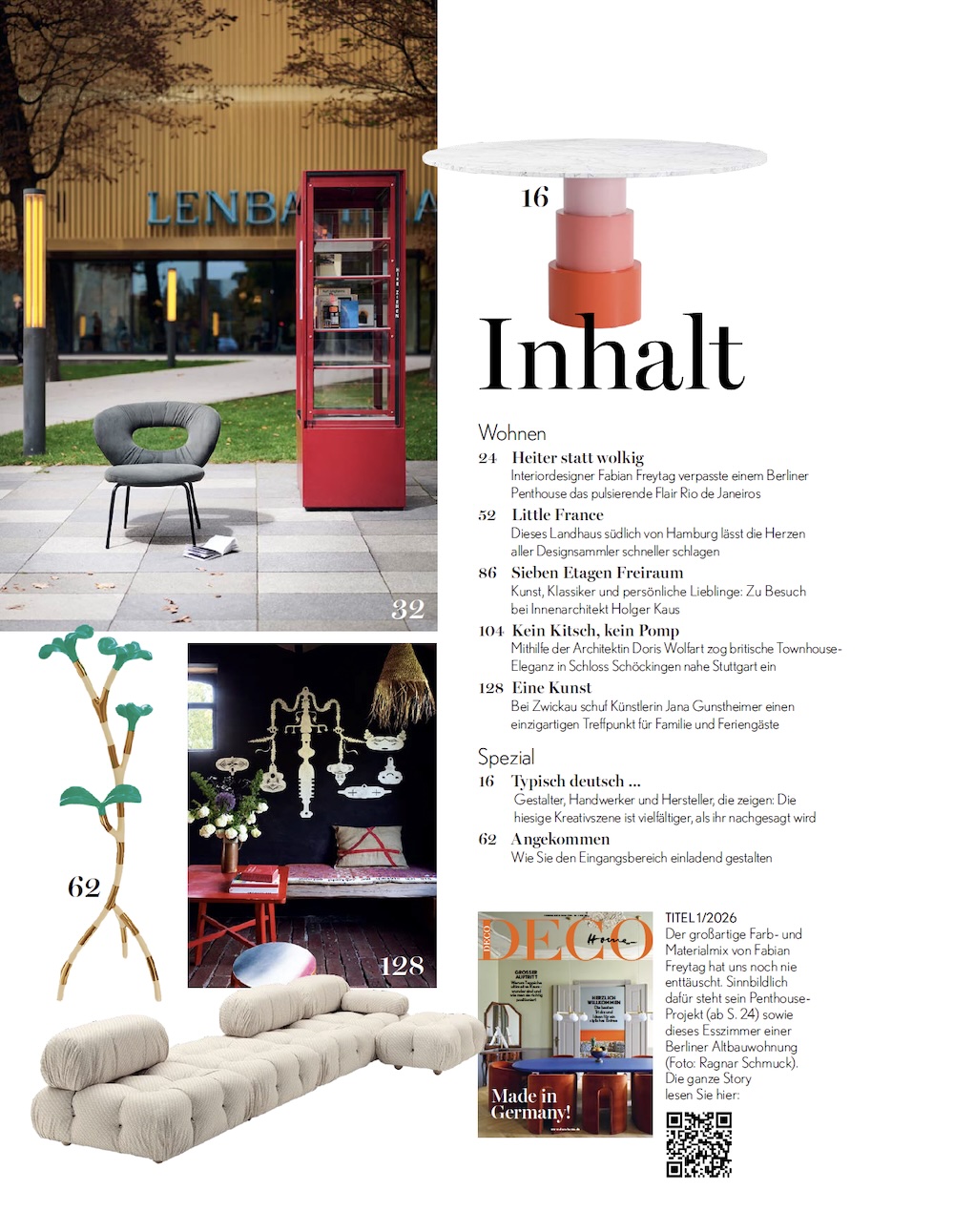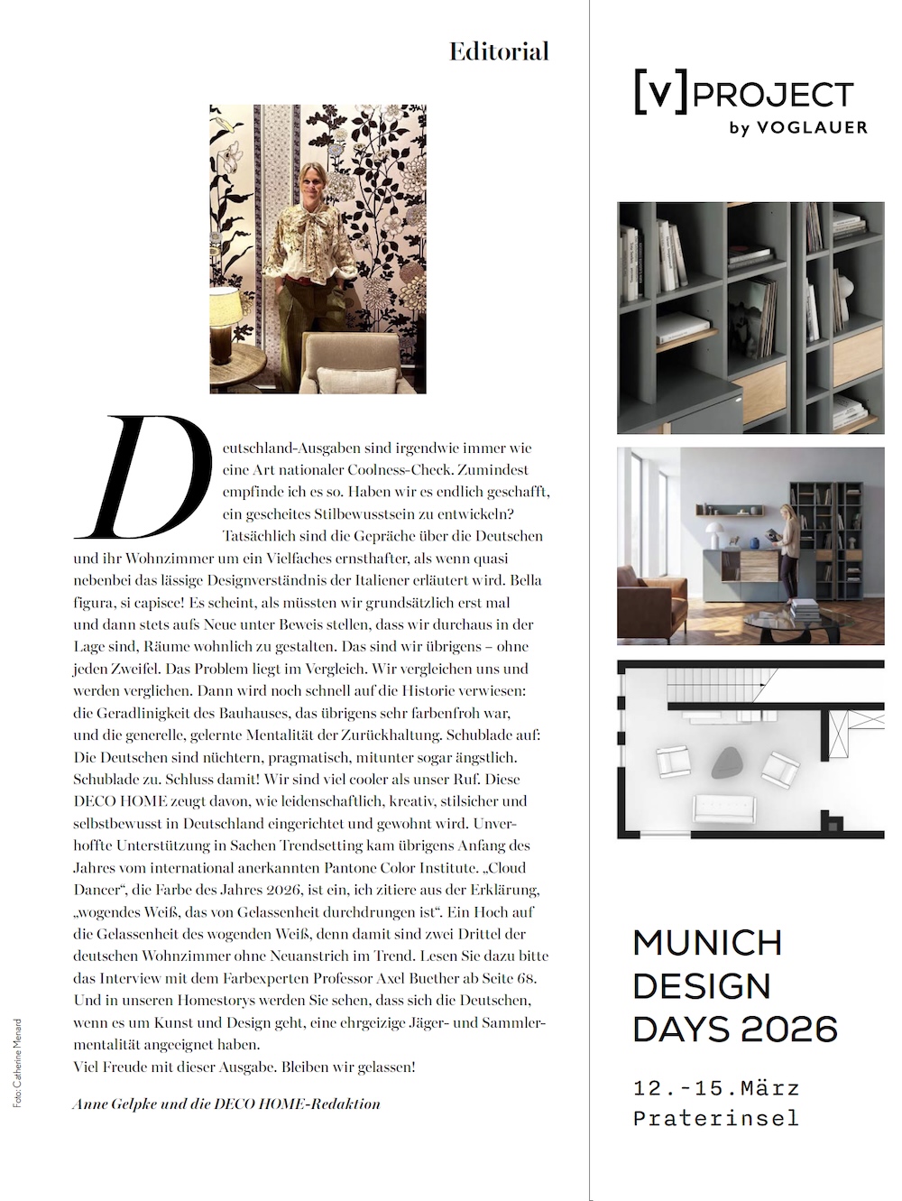 Zudem finden Sie in jeder DECO HOME internationale Einrichtungstrends von allen wichtigen Messen. Ideenreich und mit Liebe zum Detail inszeniert DECO HOME Stoffe, Accessoires und Möbel in eigenen Fotostrecken. In vielseitigen Porträts junger Designer, Kunsthandwerker und Firmen werfen wir einen Blick hinter die Kulissen der Inneneinrichtungs-Szene. Designperlen und ausgesuchte Reisetipps als auch spannende Interviews zu Stil- und Designfragen gehören ebenso zu unserer Kompetenz wie sorgfältig recherchierte Spezialthemen zu Bad, Boden, Garten, Heimtextilien, Küche oder Leuchten.